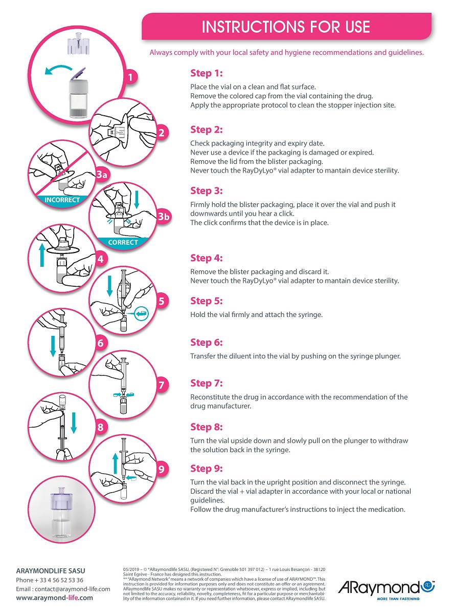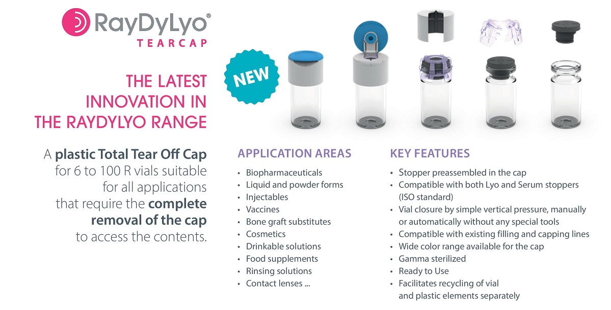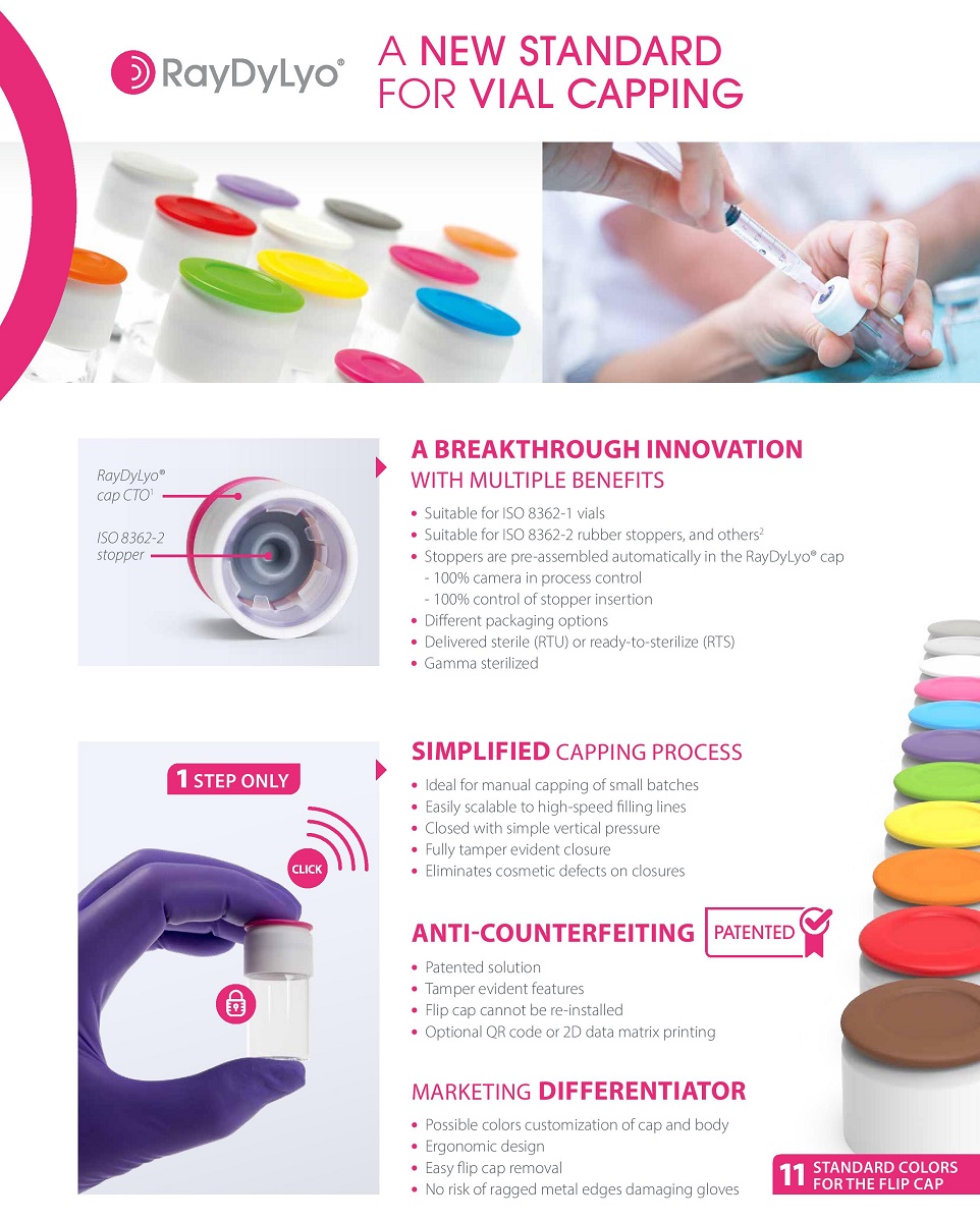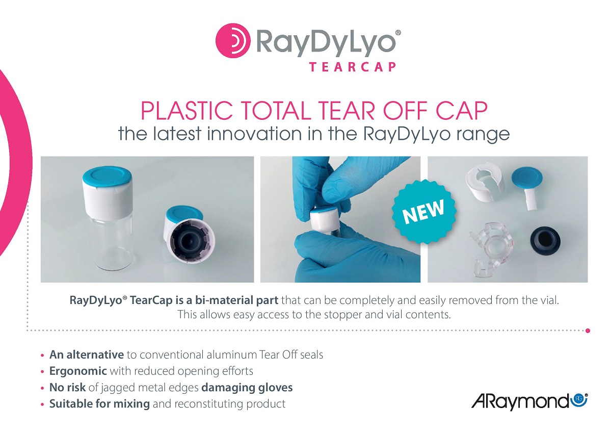 RayDyLyo® caps with integrated rubber stoppers (serum / lyo) are the new standard for closing injection vials. This push-fit cap developed by ARaymondlife is an innovative alternative to the conventional aluminum cap and is compliant with GMP Annex I. RayDyLyo® is intended for biotechnology and pharmaceutical companies, among others, and is suitable for manual use in clinical batch production as well as for filling in isolators and series production on filling lines.