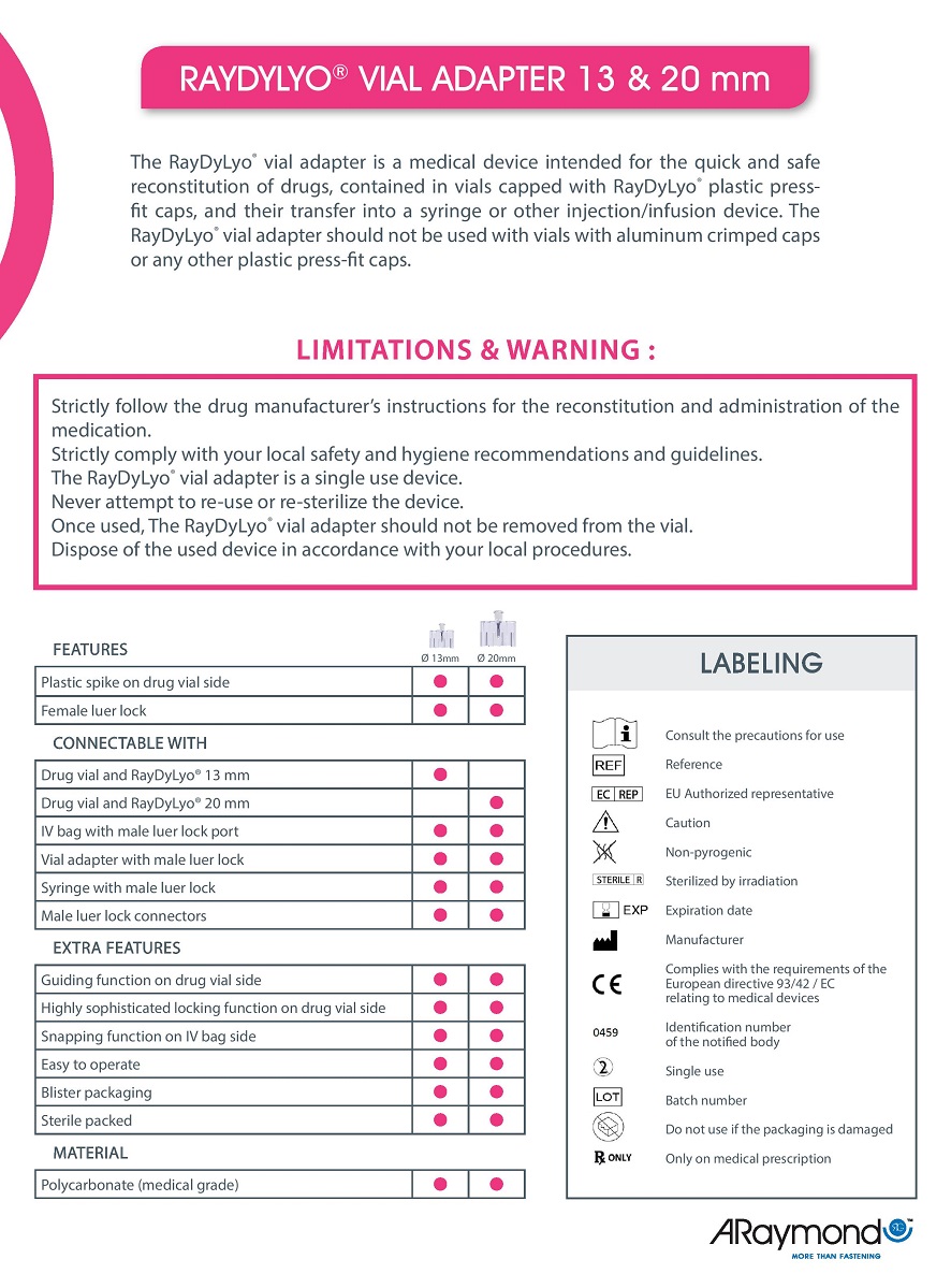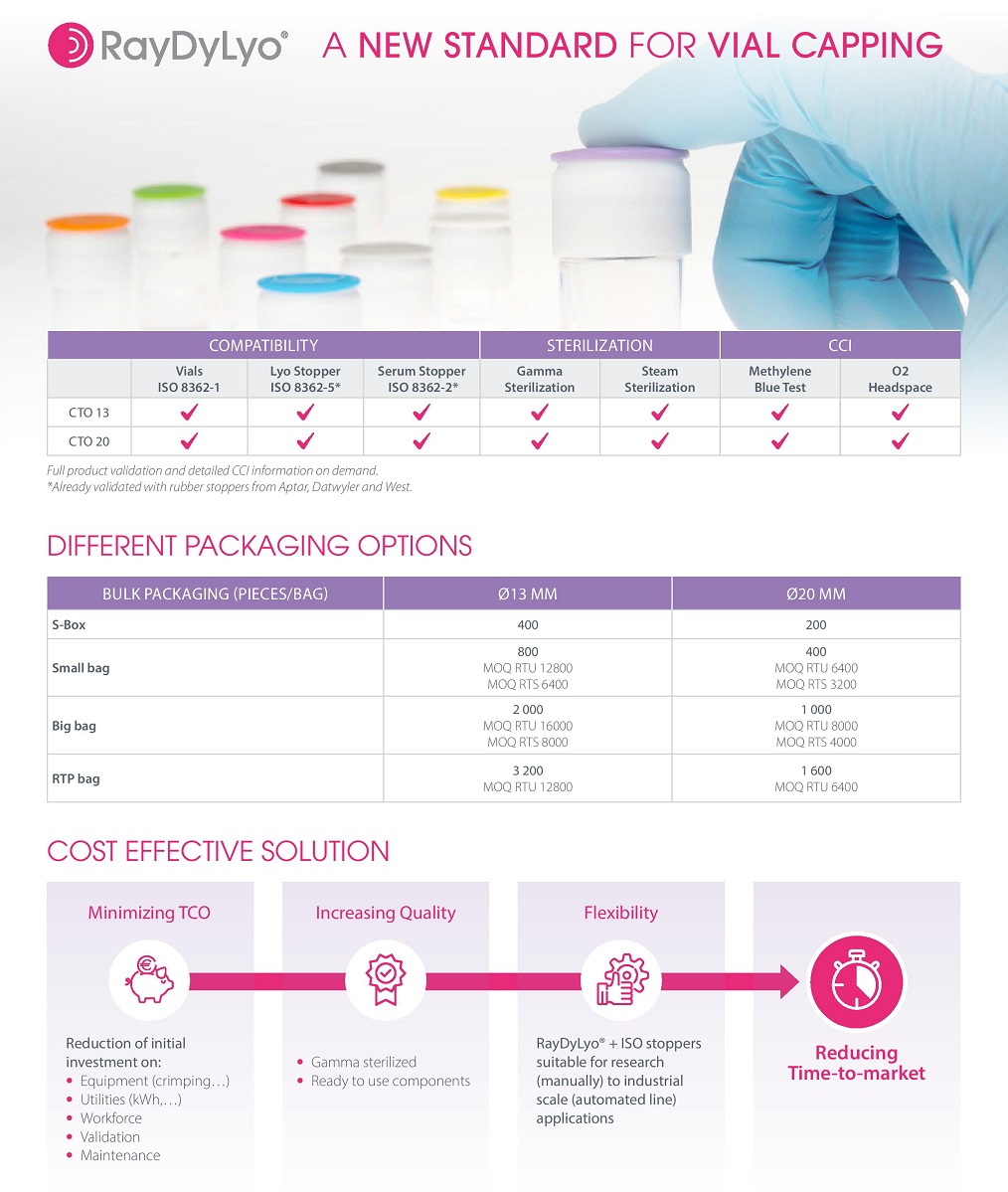 RayDyLyo® caps are available in diameters of 13 mm and 20 mm and are supplied in sterile (RTU) or sterilizable (RTS) packaging. Two versions will be available: CTO (Central Tear-Off) for injectable products and in the future TTO (Total Tear-Off) for mixing and reconstituting products. Suitable vial adapters in 13 mm and 20 mm are also available.